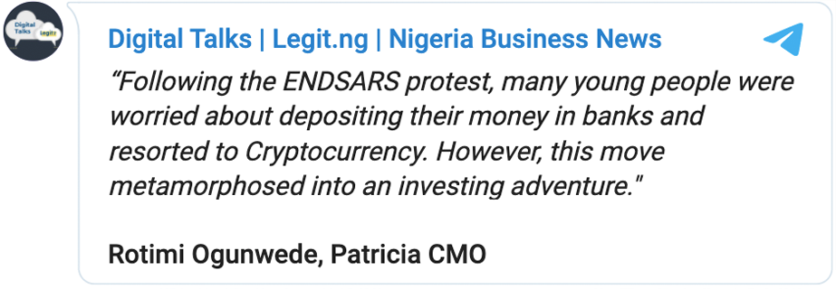 | | | №9 | | | | | Congratulations, everyone! | We've survived the first year in crypto-ban. But it seems like something went wrong, and instead of the end of crypto-operations, Nigeria gained the generation of digital rebels. To clarify things, we invited an expert to Digital Talks. Meet Rotimi Ogunwede, the Chief Marketing Officer of Patricia Technologies, a marketplace for digital assets. | | | | | | | Better awareness, and rebellious traders: Side effects of the ban | In February 2021, CBN directed all commercial banks to close all accounts in crypto. After this happened, the knowledge on cryptocurrency subject grew in Nigeria immediately. That was one of the side effects that followed the new CBN policy, according to Rotimi Ogunwede. While speaking on Legit.ng Digital talks interview, he disclosed more reasons why Nigerians can't stay away from crypto. What's behind the traders' psychology? Read it here. | | | | | | Patricia almost bankrupted by CBN regulation: The story of relocation to Europe | CBN policy affected Particia and made them lose 90% of business within 24 hours. According to Rotimi Ogunwede, the adoption of crypto in Nigeria is a form of rebellion for a country trying to stifle innovation and creativity. The computer science graduate said Patricia was moribund for a month before it decided to adopt a new model and set up shop in Europe where it has seen its fortunes grow immensely. How did they turn challenges into opportunities? See here. | | | | | | The traditional banks are not giving up! Zenith top, Wema least | | | | | | | | | | Thanks for reading! We are more than happy to have you with us!